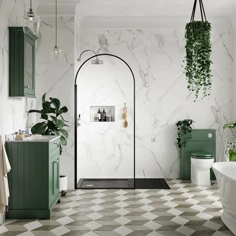 Make your shower a focal point of the bathroom with the Arezzo Arched Framed Wetroom Screen with Tray. The striking frame in matt black aluminium instantly lends your space a modern, designer feel, the generously proportioned walk in shower tray is 1600mm wide, providing a decent sized space for drying off after your shower. Its low profile design in grey slate effect acrylic has a minimalist appeal and is light and durable too. Conveniently, the surface is also super easy to clean. To up the indulgence factor even further, pair the Arezzo shower door with a matching Matt Black Fixed Shower Head from the same brand.