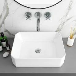 The modern shape of this stylish 8-sided rectangular counter top basin will create a contemporary feel in any bathroom. Made from high quality vitreous china with a high gloss white finish, the basin is perfect for counter tops and is best complemented with a high rise basin mixer or wall mounted tap. Some small dimensional variation may occur due to manufacturing tolerances. Waste not included.