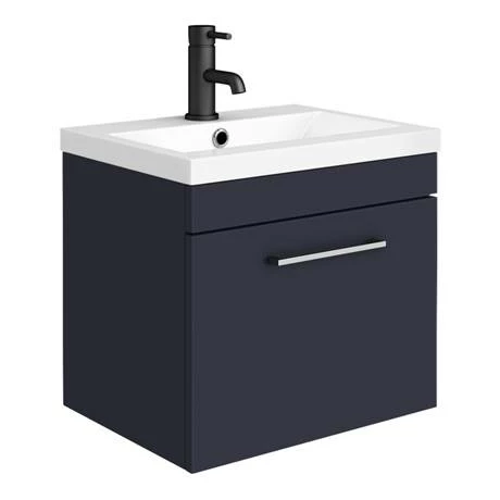 The contemporary matt blue Arezzo furniture package, with it’s clean lines this suite is perfect for renewing the style in any bathroom. The wall hung vanity unit’s stylish modern design hides all unsightly pipework creating a neat modern look. The units soft-closing drawer provides plenty of storage space for toiletries, helping to keep your bathroom clutter free. Features eye-catching and stylish matt blue finish with a on-trend contrasting modern polished chrome square bar handle. WC unit comes supplied with a dual flush concealed WC cistern and modern toilet with soft closing seat.