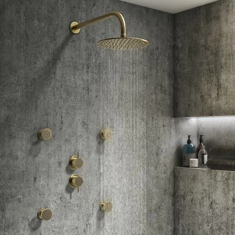 The Arezzo Brushed Brass Concealed Individual Diverter and Thermostatic Control Shower Valve Pack features a minimalist round design. This shower valve pack is perfect for installing in a concealed arrangement, linked to two outlets.