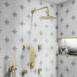 Bring elegance to the modern bathroom with this Arezzo Brushed Brass Industrial Style Push Button 3 outlet complete shower. The package includes a concealed push button shower valve with integrated diverter, handset, fixed overhead shower head and 4 round body jets. The stylish concealed shower valve offers thermostatic showering via three easy-to-operate controls, operates two shower accessories separately or simultaneously and diverts to a third option. The solid brass construction makes the valve durable and quick to clean thanks to the smooth finish. The ideal solution for multi-option showering.