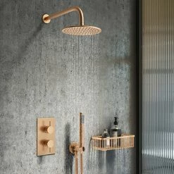 Supplied with a matching 200mm round fixed shower head with swivel joint and a round outlet elbow with parking bracket, flex & pencil handset. The solid brass valve body comes with a easy to clean contemporary rectangular face plate. The Arezzo brushed bronze finish adds warmth and uniqueness to your bathroom.