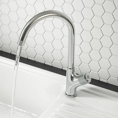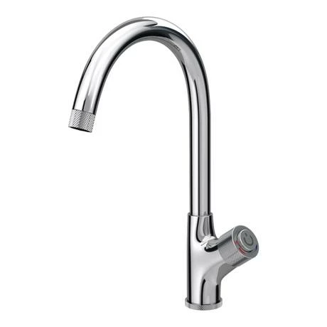 The stylish Arezzo industrial-style polished chrome 1 touch smart control mono kitchen mixer tap is perfect for adding a striking finishing touch to your contemporary kitchen. Features a swivel spout and a easy to use instant 1 touch start/stop water flow activation, ideal for when your hands are full or dirty. Temperature and flow is easily adjusted by simply turning the mixing valves located on the tap body. Crafted to the highest standards, this stunning deck mounted kitchen mixer tap features a stripped-down aesthetic with a round knurled textured tap head controls, perfect for creating an eye catching industrial look in your kitchen. Plated in a polished chrome finish which is highly resistant to corrosion.