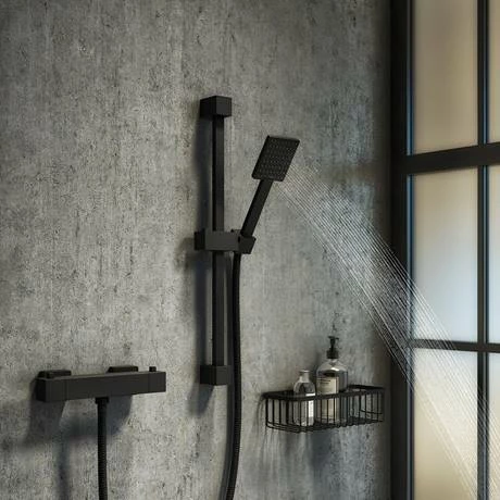 Create a striking shower area with the Arezzo Matt Black Square Slide Rail Kit. The rail comes in an eye catching matt black finish, with an angular profile to complement the modern bathroom. You can adjust the height and angle of the shower head using the smooth slider rail and pivot function, so that everyone can experience their ideal shower arrangements. With a rust resistant hose and an easy to clean head, it can be kept gleaming with minimum fuss. Why not pair this slider rail kit with the Arezzo Matt Black Square Thermostatic Bar Shower Valve?