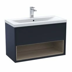 Arezzo Senza 800mm Matt Blue / Grey Vicenza Oak 1 Drawer Wall Hung Vanity Unit with Open Shelf + Mid-Edge Ceramic Basin
